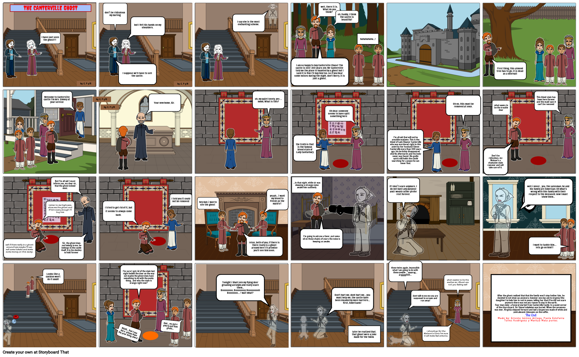 After the ghost realized that that the family won't stop bother him, he decided to not show up anymore, however one day ask to virginia (the daughter) to help him to rest in peace, telling her that if he did not scare anymore there was not any reason to stay in the earth.Four days later, a funeral started from Canterville Castle. In a quiet corner of the churchyard, Sir Simon'sskeleton was buried. When the ceremony was over, Virginia stepped forward and laid a largecross made of white and pink almond-blossoms on the coffin. The EndMade by: Ernesto Gómez Arriaga, Paola Estefania Torres Rodriguez y Maritza Mata porras.