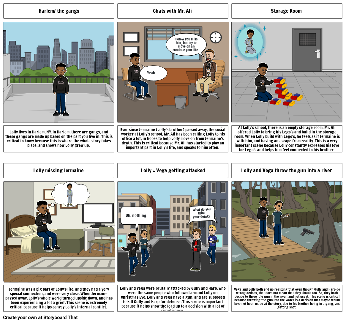 Vega and Lolly both end up realizing that even though Gully and Harp do wrong actions, that does not mean that they should too. So, they both decide to throw the gun in the river, and not use it. This scene is critical because throwing the gun into the water is a decision that maybe would have not been made at the story, due to his brother being in a gang, and getting shot.