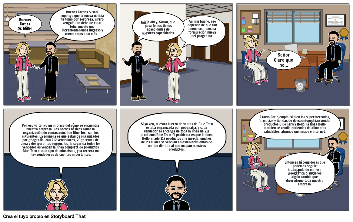 Por eso ya tengo un informe del cómo se encuentra nuestra empresa. Los hechos básicos sobre la organización de ventas actual de Blue Tern son los siguientes. La primera es que estamos organizados por geografía, con 212 vendedores, 20gerentes de área y dos gerentes regionales; la segunda todos los vendedor es venden la línea completa de productos Blue Tern a todo tipo de minoristas; y la tercera no hay vendedores de cuentas importantes.