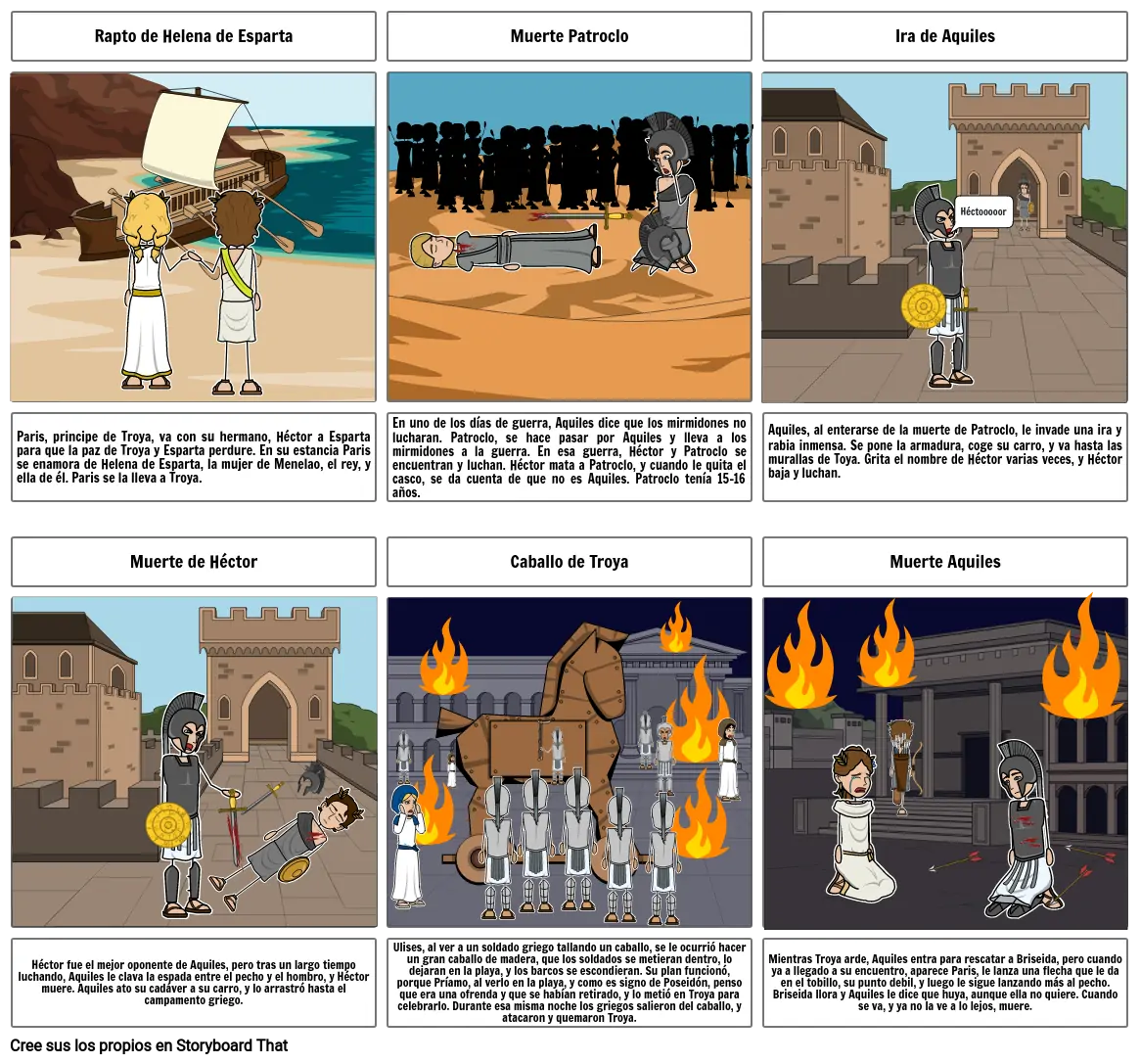 Aquiles, al enterarse de la muerte de Patroclo, le invade una ira y rabia inmensa. Se pone la armadura, coge su carro, y va hasta las murallas de Toya. Grita el nombre de Héctor varias veces, y Héctor baja y luchan.