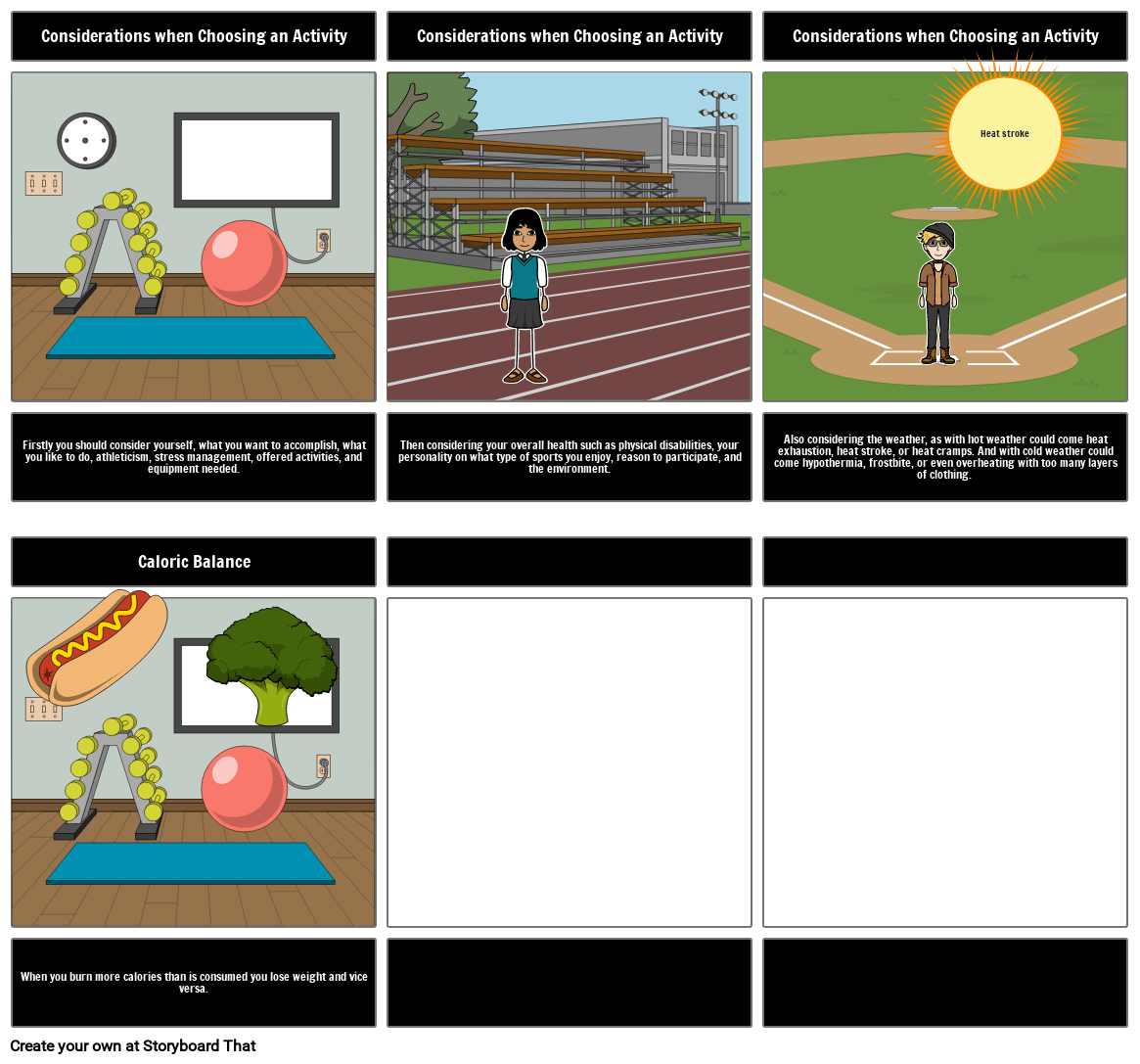 Also considering the weather, as with hot weather could come heat exhaustion, heat stroke, or heat cramps. And with cold weather could come hypothermia, frostbite, or even overheating with too many layers of clothing.