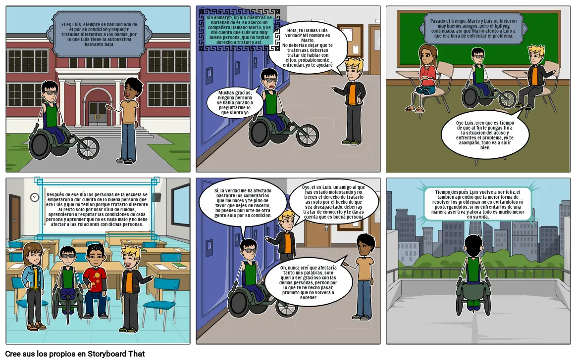 Después de ese día las personas de la escuela se empezaron a dar cuenta de lo buena persona que era Luis y que no tenian porque tratarlo diferente al resto solo por usar silla de ruedas, aprendieron a respetar las condiciones de cada persona y aprender que no es nada malo y no debe afectar a las relaciones con dichas personas.