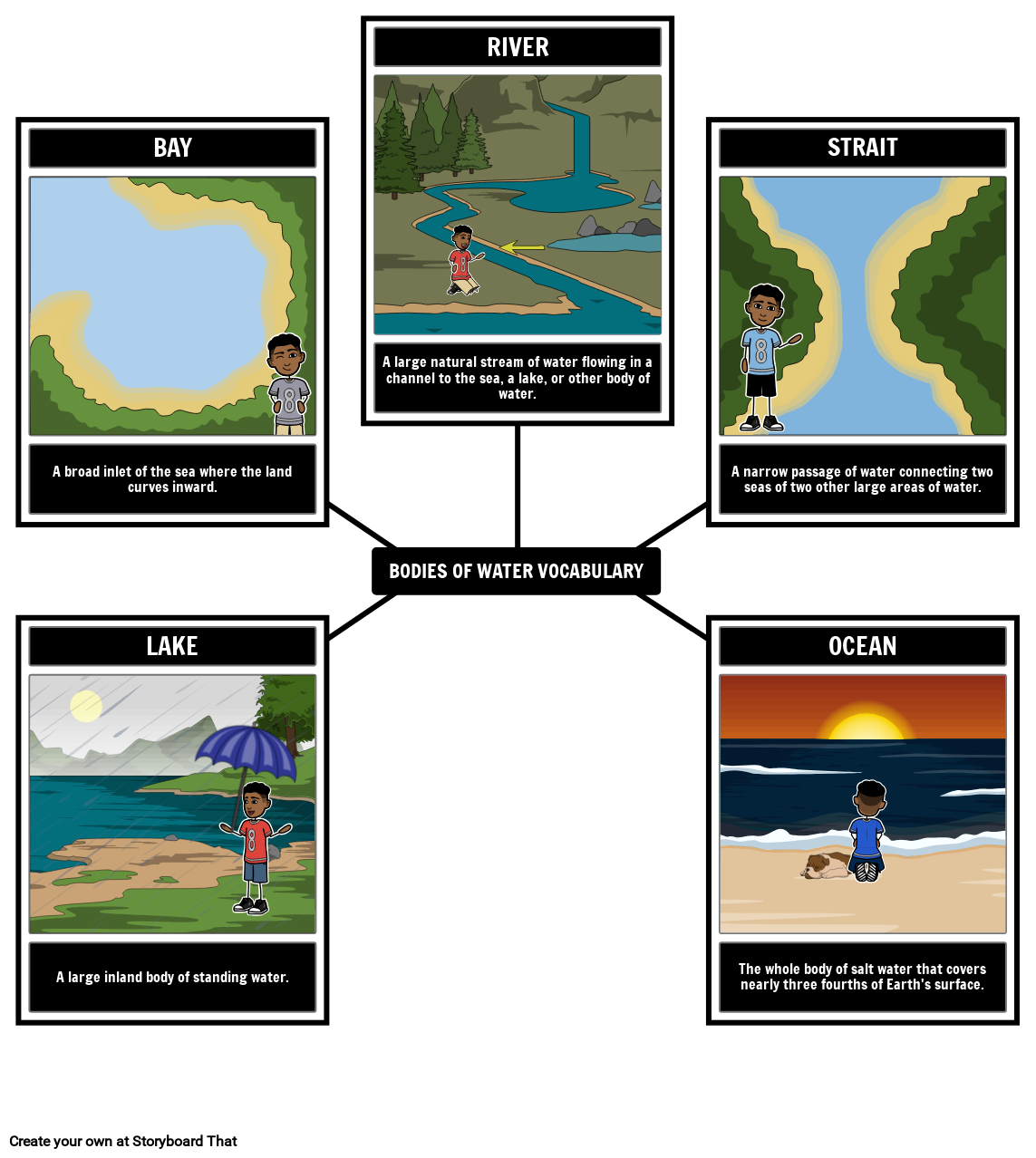 עזור לתלמידים לזכור גופי מים שונים! צור מפת עכביש הממחישה ומגדירה גופי מים שונים.