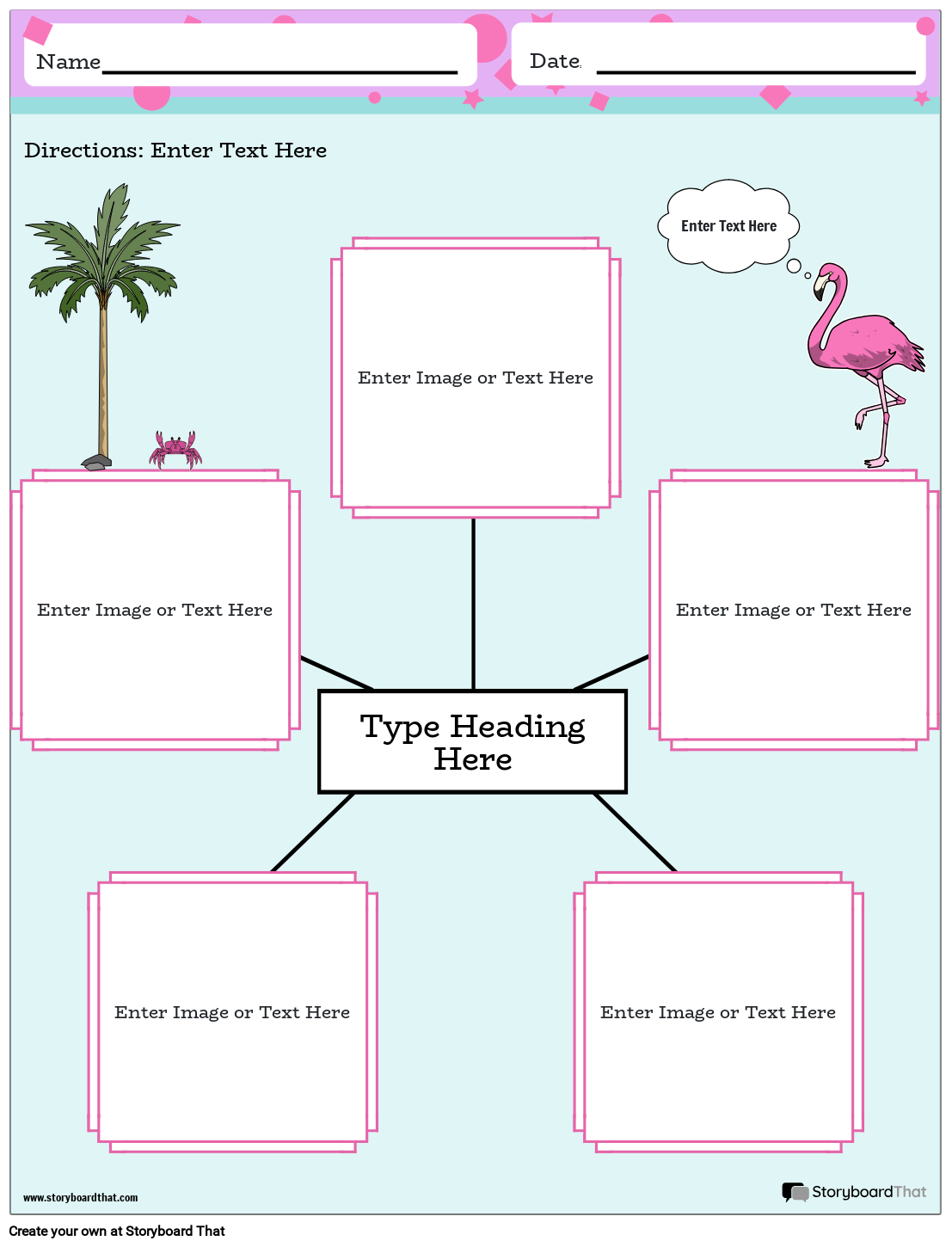 स्पाइडर मैप वर्कशीट जिसमें 5 स्पोक और एक उद्धरण लिखने और एक चरित्र जोड़ने के लिए कमरा है।