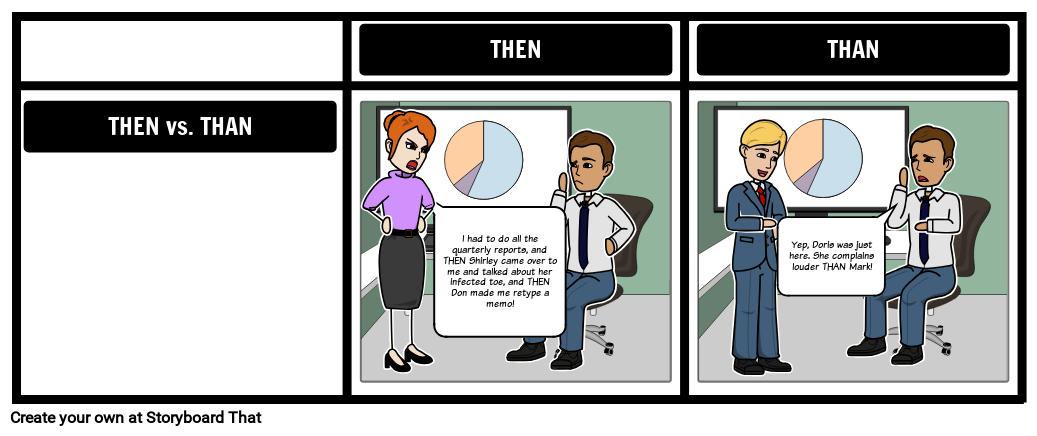 Storyboarding is a perfect way for students to demonstrate their knowledge of the differences between "then/than" and "there/they’re/their", while exercising their creative talents. The clear, concise structure of storyboards allows teachers to immediately determine whether students have mastered the objectives. To increase practice and further ingrain learning, teachers can assign students to create multiple storyboards, and use more examples, allowing students to fully internalize the objectives, while still giving them the opportunity to have fun and be creative.