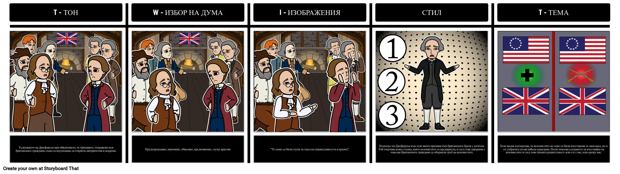 TONE | Тълкуването на Джеферсън при обяснението, че призивите, отправени към британските граждани, също са неуспешни, са открити, авторитетни и искрени. |