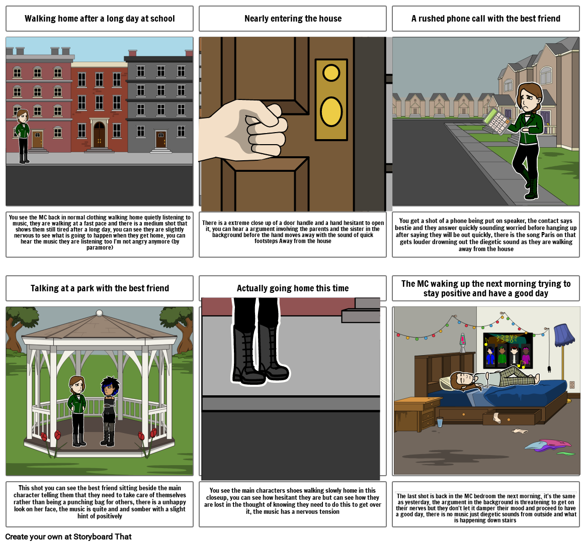 You see the MC back in normal clothing walking home quietly listening to music, they are walking at a fast pace and there is a medium shot that shows them still tired after a long day, you can see they are slightly nervous to see what is going to happen when they get home, you can hear the music they are listening too I’m not angry anymore (by paramore)