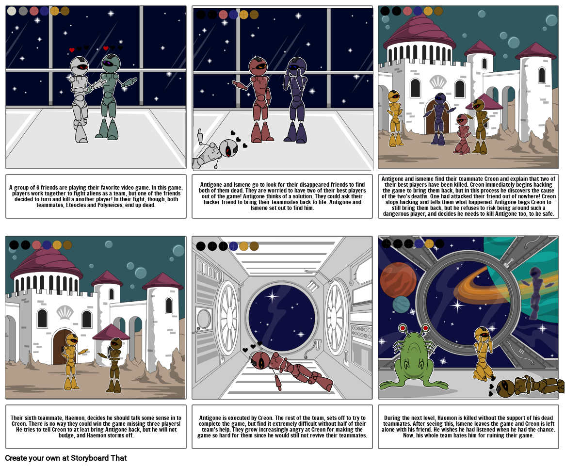 A group of 6 friends are playing their favorite video game. In this game, players work together to fight aliens as a team, but one of the friends decided to turn and kill a another player! In their fight, though, both teammates, Eteocles and Polyneices, end up dead.