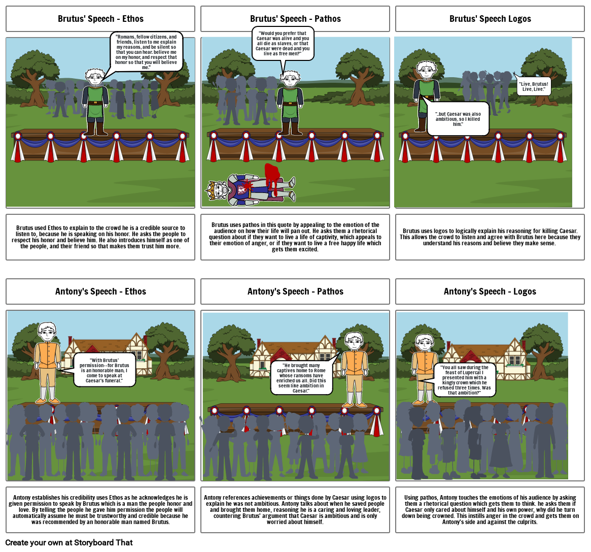 Brutus uses logos to logically explain his reasoning for killing Caesar. This allows the crowd to listen and agree with Brutus here because they understand his reasons and believe they make sense.