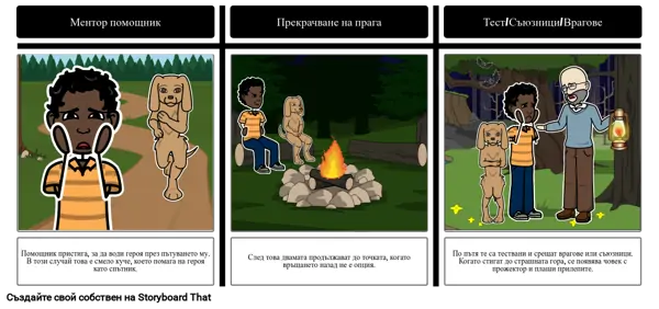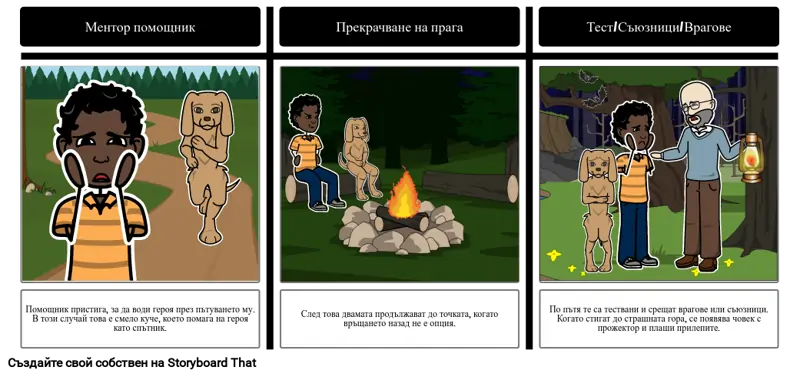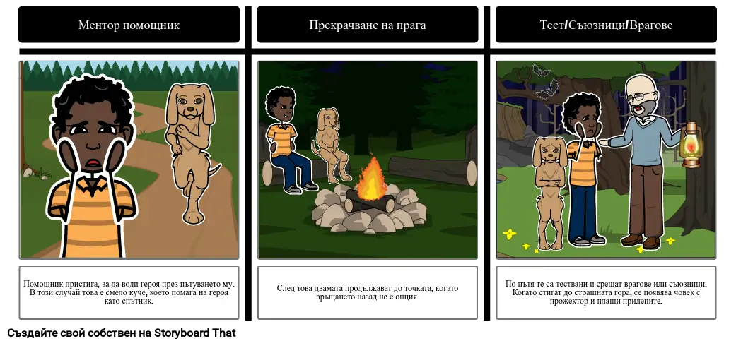 Помощник пристига, за да води героя през пътуването му. В този случай това е смело куче, което помага на героя като спътник.