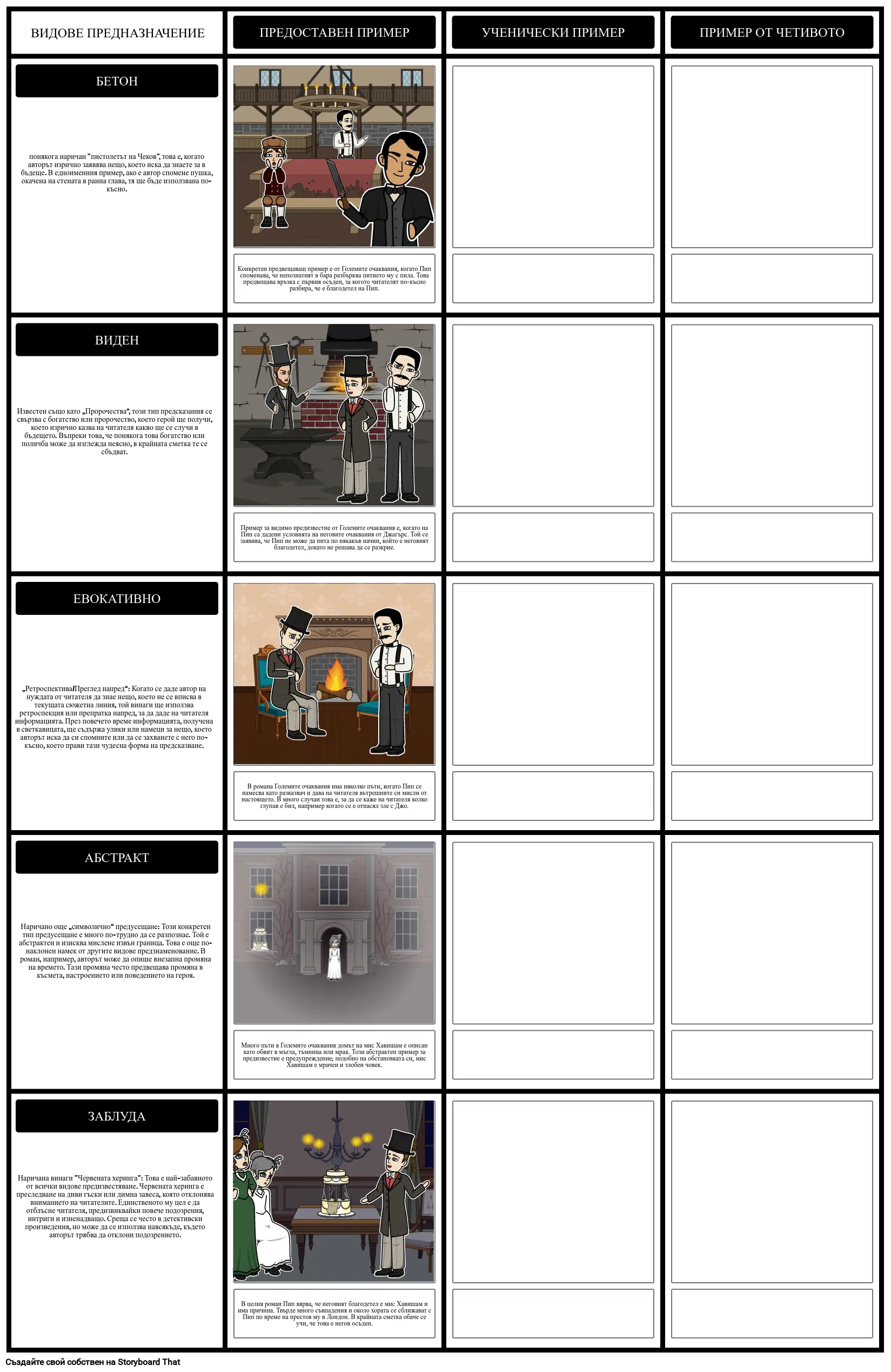 Конкретен предвещаващ пример е от Големите очаквания, когато Пип споменава, че непознатият в бара разбърква питието му с пила. Това предвещава връзка с първия осъден, за когото читателят по-късно разбира, че е благодетел на Пип.