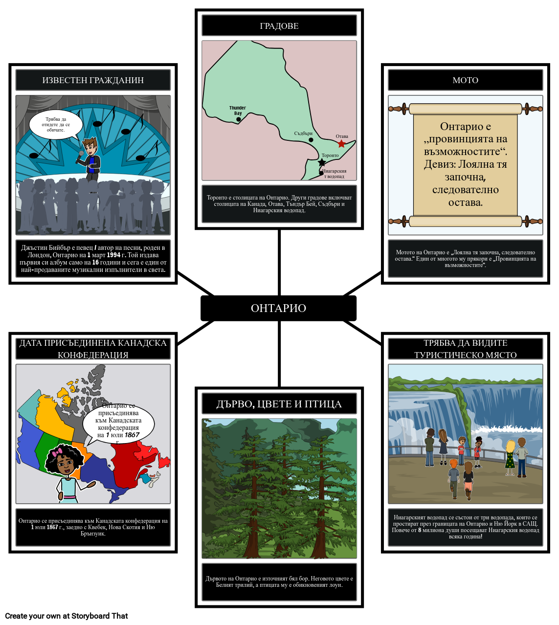 Създайте карта на паяк, която илюстрира различни забавни факти и информация за Онтарио или друга канадска провинция.