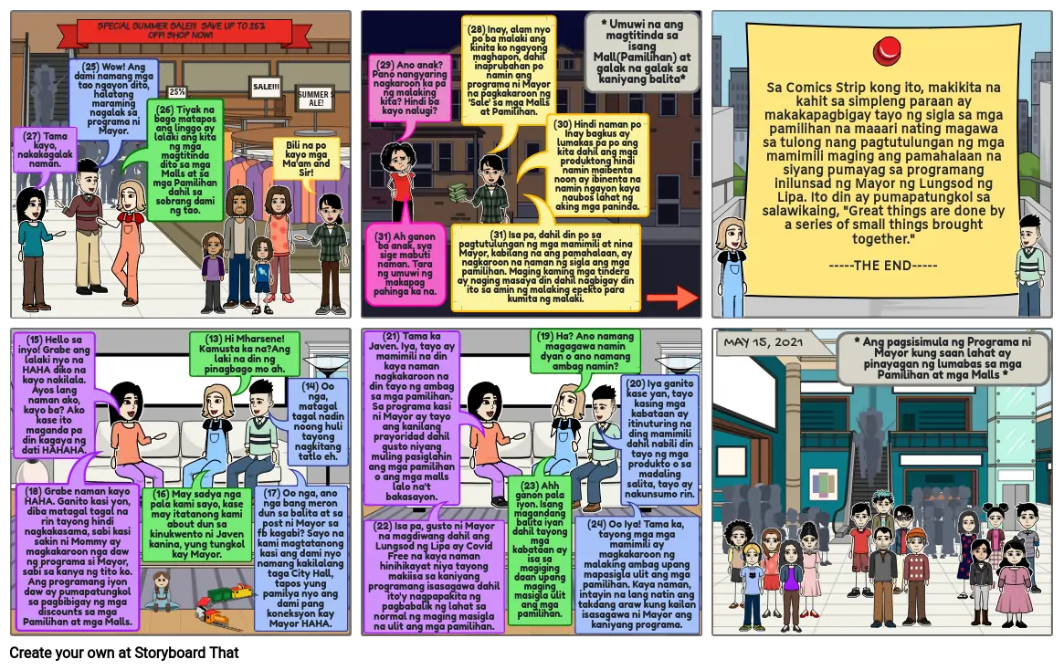 Sa Comics Strip kong ito, makikita na kahit sa simpleng paraan ay makakapagbigay tayo ng sigla sa mga pamilihan na maaari nating magawa sa tulong nang pagtutulungan ng mga mamimili maging ang pamahalaan na siyang pumayag sa programang inilunsad ng Mayor ng Lungsod ng Lipa. Ito din ay pumapatungkol sa salawikaing, "Great things are done by a series of small things brought together."-----THE END-----