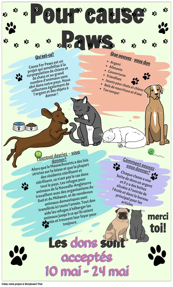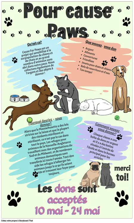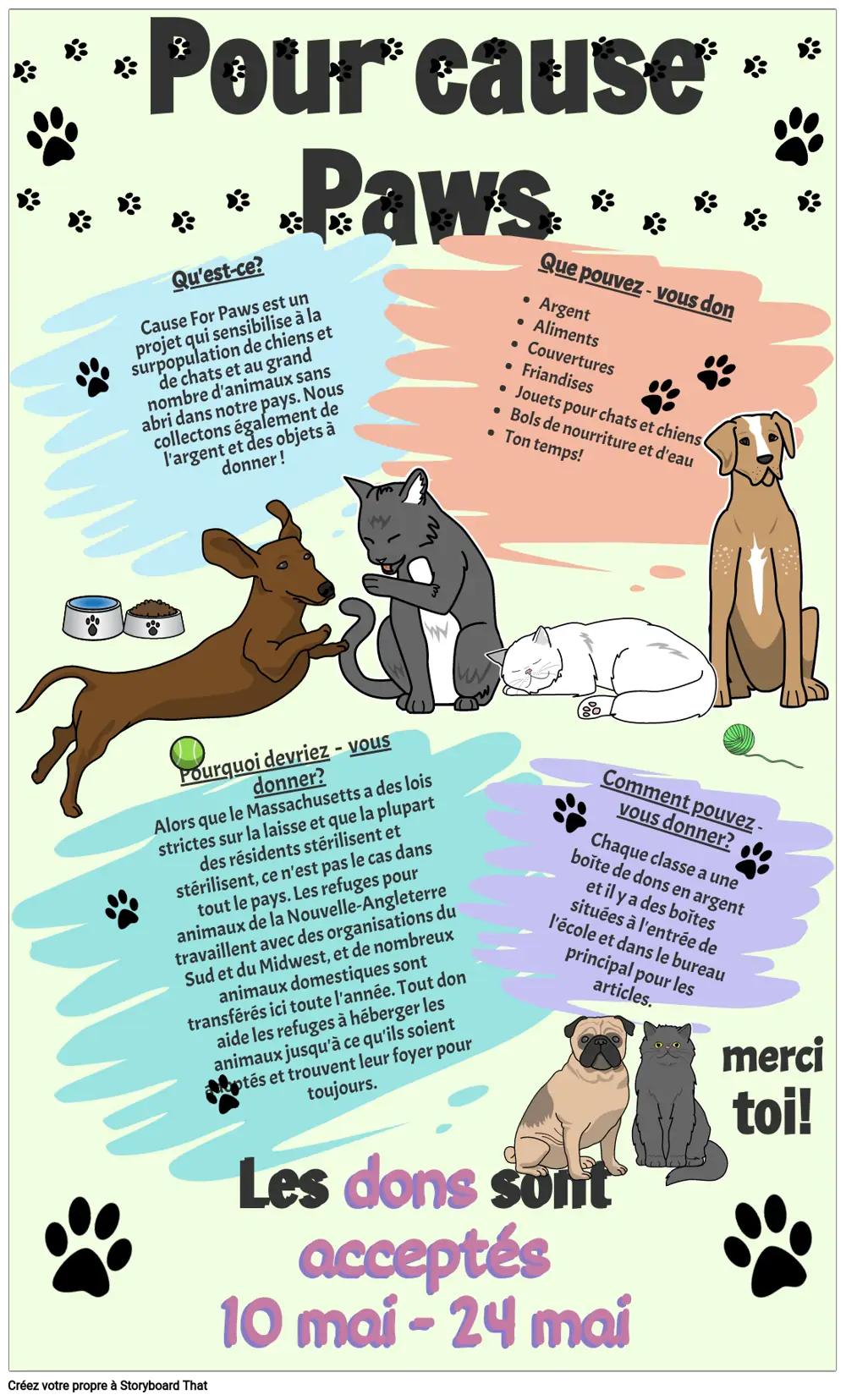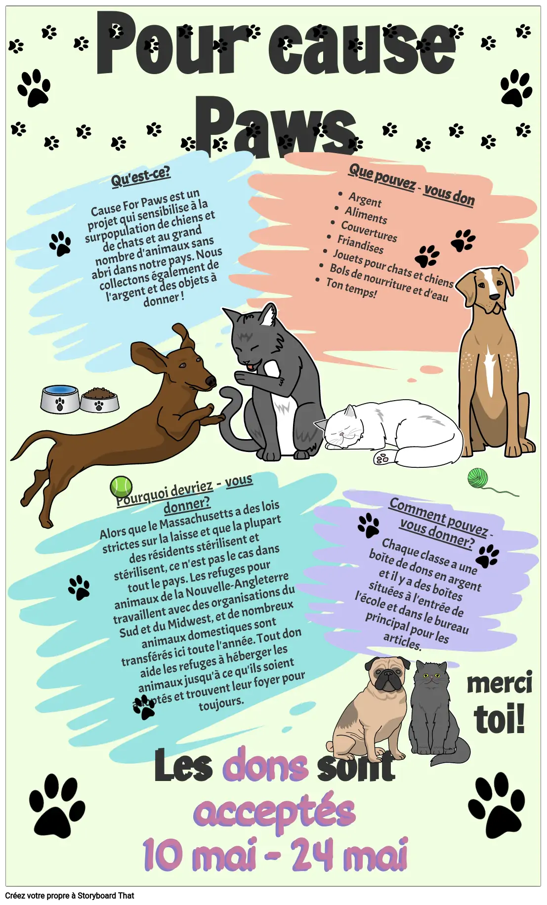 Qu'est-ce? Cause For Paws est un projet qui sensibilise à la surpopulation de chiens et de chats et au grand nombre d'animaux sans abri dans notre pays. Nous collectons également de l'argent et des objets à donner !