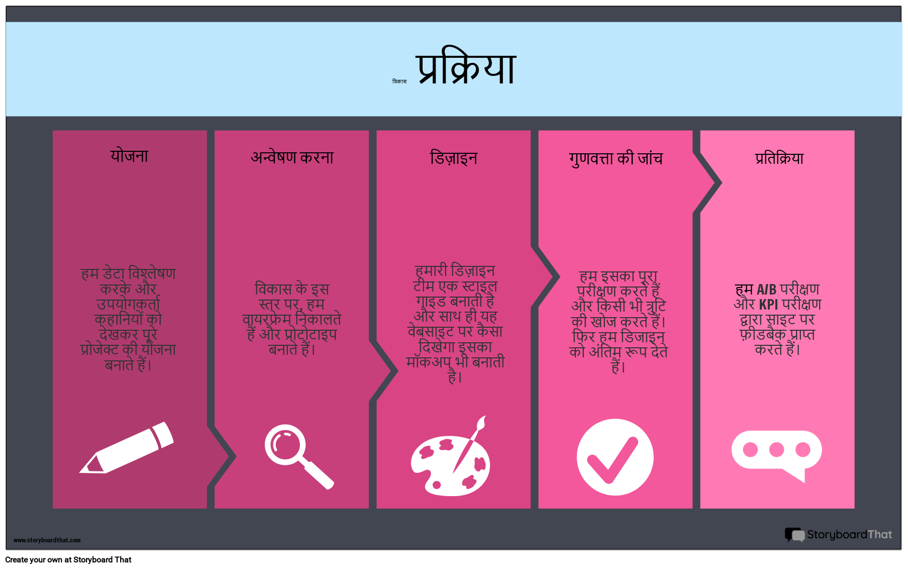 हम डेटा विश्लेषण करके और उपयोगकर्ता कहानियों को देखकर पूरे प्रोजेक्ट की योजना बनाते हैं। विकास के इस स्तर पर, हम वायरफ्रेम निकालते हैं और प्रोटोटाइप बनाते हैं। हमारी डिज़ाइन टीम एक स्टाइल गाइड बनाती है और साथ ही यह वेबसाइट पर कैसा दिखेगा इसका मॉकअप भी बनाती है। हम इसका पूरा परीक्षण करते हैं और किसी भी त्रुटि की खोज करते हैं। फिर हम डिजाइन को अंतिम रूप देते हैं। हम A/B परीक्षण और KPI परीक्षण द्वारा साइट पर फ़ीडबैक प्राप्त करते हैं।