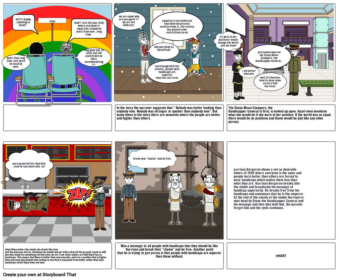 Harrison Bergeron shows a not so desirable future of 2081 where everyone is the same and people born better then others are forced to wear handicaps which makes them less than what they are. Harrison Bergeron breaks into the studio and broadcasts his message of handicap superiority. He breaks free from his handicaps and announces that he is the emperor. At the end of the events at the studio Harrison is shot dead by Diane the Handicapper General and his message and idea dies with him. His parents forget him and the cycle continues.