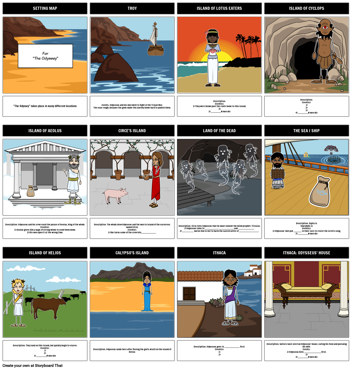 Events: Odysseus and his men went to fight in the Trojan War. The seas rough, because the gods make the journey home hard to punish them.