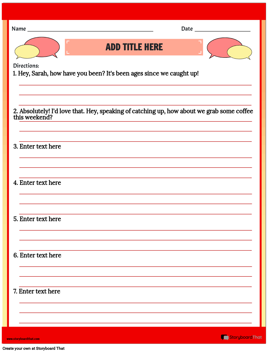- Independent Practice: Allow students individual time to complete the rest of the dialogue writing worksheet at their own pace. Have them turn completed sheets in for review and feedback.