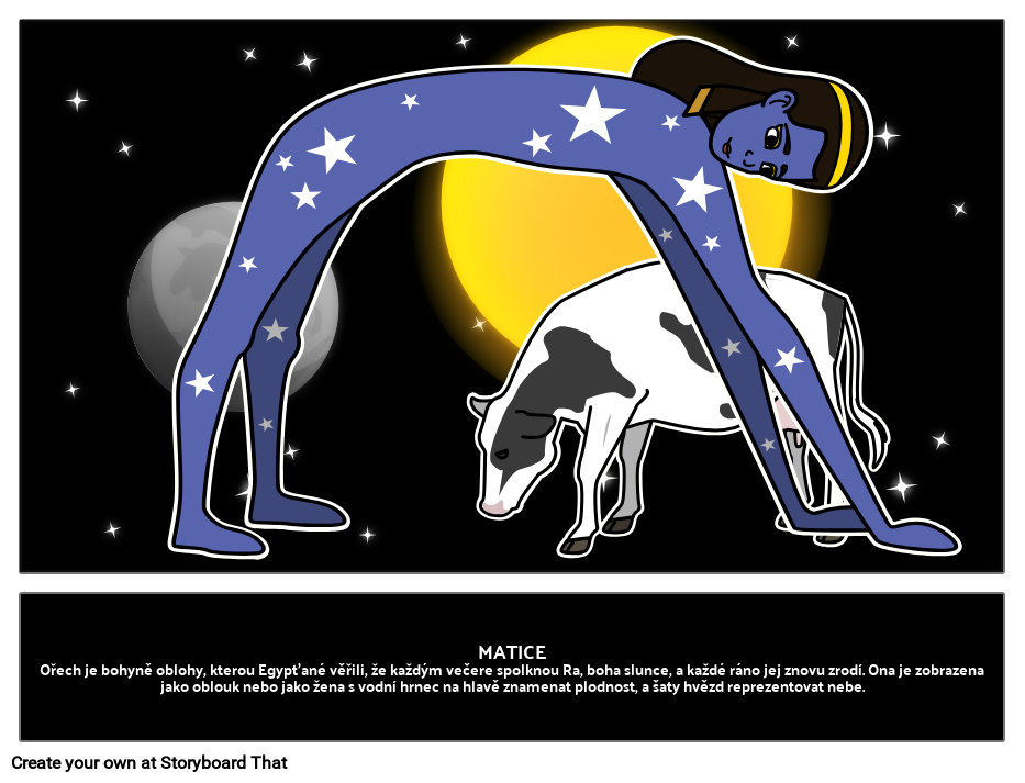 Ořech je bohyně oblohy, kterou Egypťané věřili, že každý večer polkali Ra, boha slunce, a každý den ho zrodili znovu. Ona je zobrazena s vodní hrnec na hlavě znamenat plodnost, a šaty hvězd reprezentovat nebe.