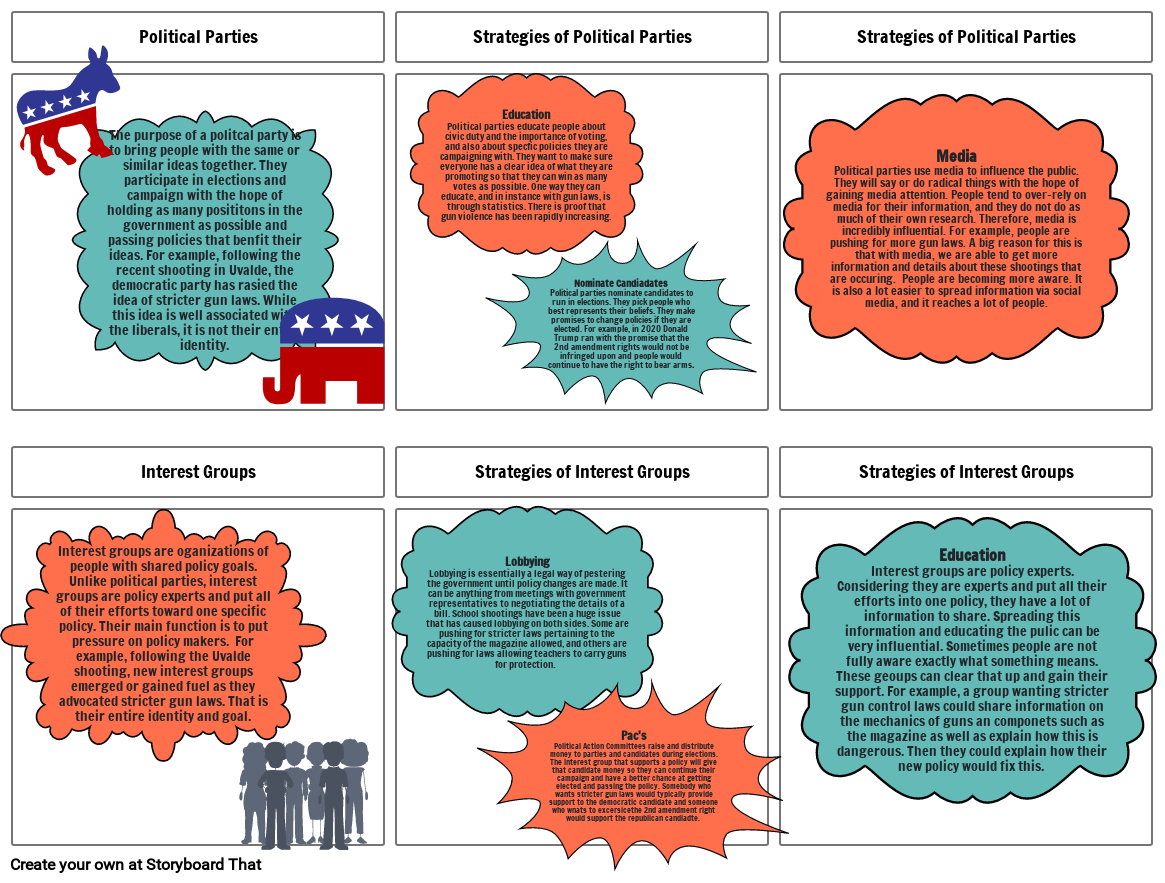 Media Political parties use media to influence the public. They will say or do radical things with the hope of gaining media attention. People tend to over-rely on media for their information, and they do not do as much of their own research. Therefore, media is incredibly influential. For example, people are pushing for more gun laws. A big reason for this is that with media, we are able to get more information and details about these shootings that are occuring. People are becoming more aware. It is also a lot easier to spread information via social media, and it reaches a lot of people.