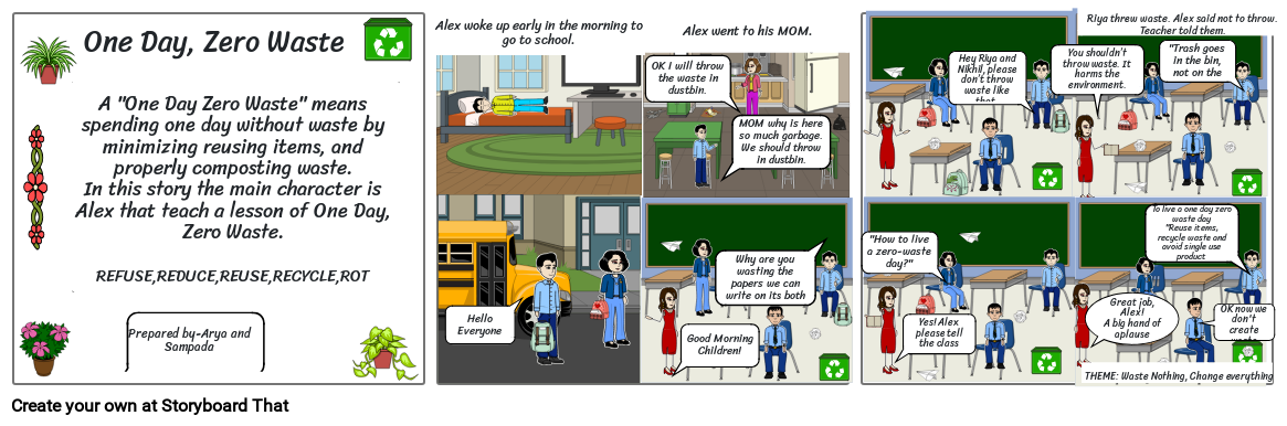 A "One Day Zero Waste" means spending one day without waste by minimizing reusing items, and properly composting waste.In this story the main character is Alex that teach a lesson of One Day, Zero Waste.REFUSE,REDUCE,REUSE,RECYCLE,ROT
