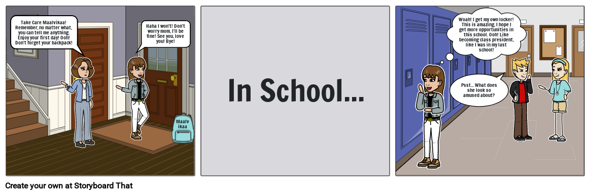 Take Care Maalvikaa! Remember, no matter what, you can tell me anything. Enjoy your first day! Ooh! Don't forget your backpack!