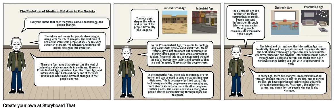 There are four ages that categorizes the level of technological advancements in media and these are Pre-industrial Age, Industrial Age, Electronic Age, and Information Age. Each and every one of them are unique and have made different changed in the people's norms.
