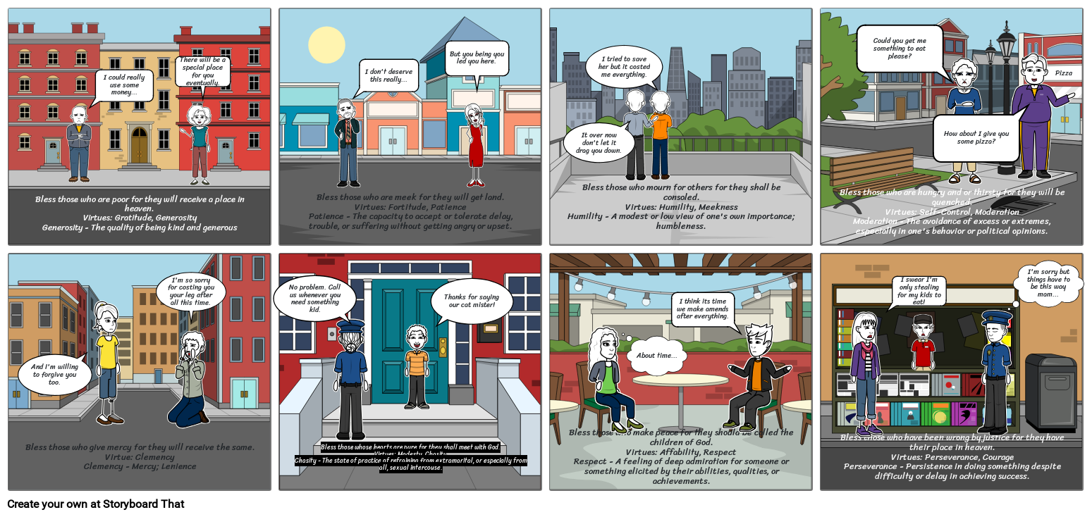 Bless those who are poor for they will receive a place in heaven.Virtues: Gratitude, GenerosityGenerosity - The quality of being kind and generous