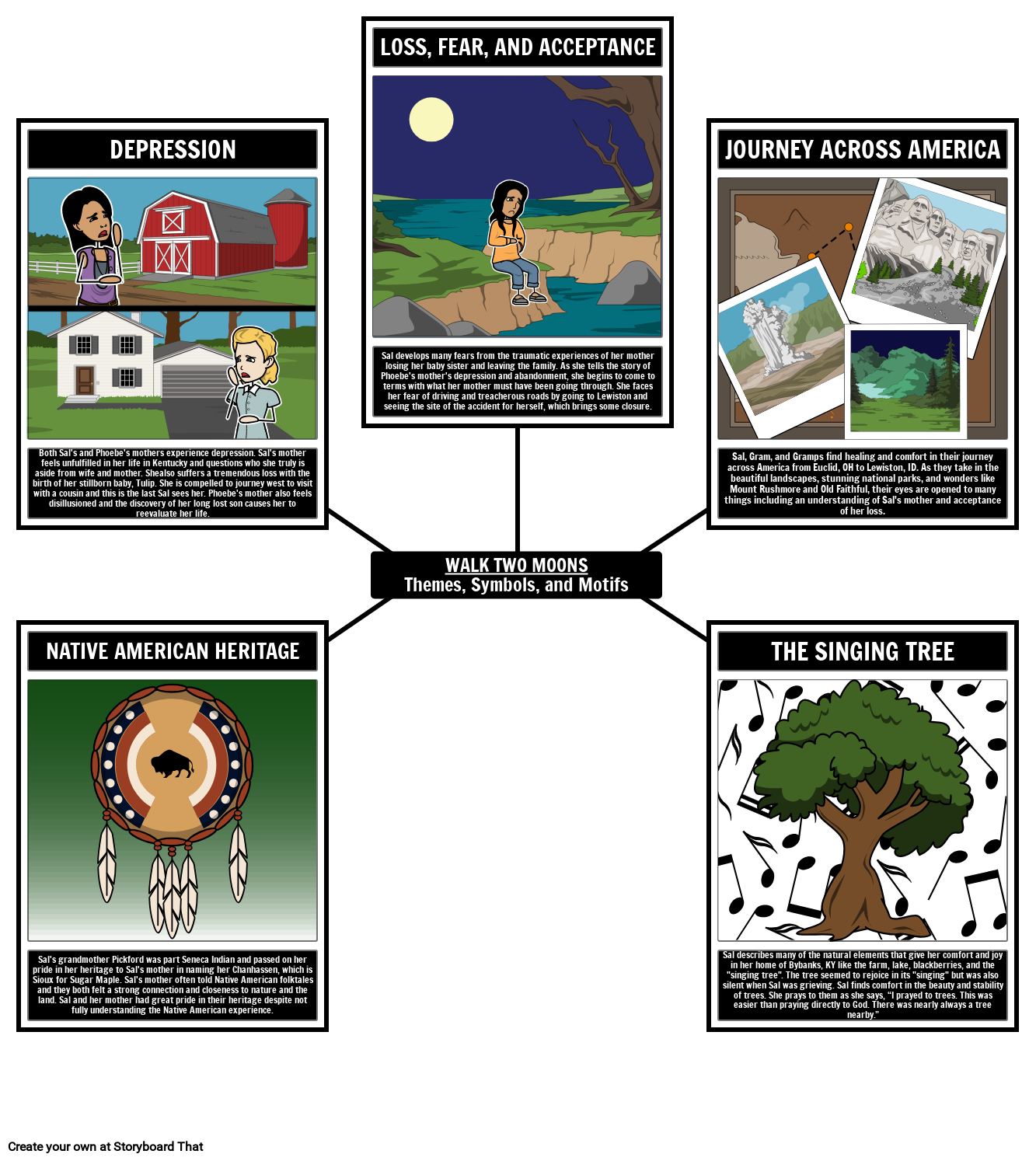 يمكن للطلاب تتبع الموضوعات والرموز والزخارف المختلفة الموجودة في Walk Two Moons بواسطة Sharon Creech وإنشاء خريطة عنكبوتية تقوم بتسميتها وتعريفها وتوضيحها.