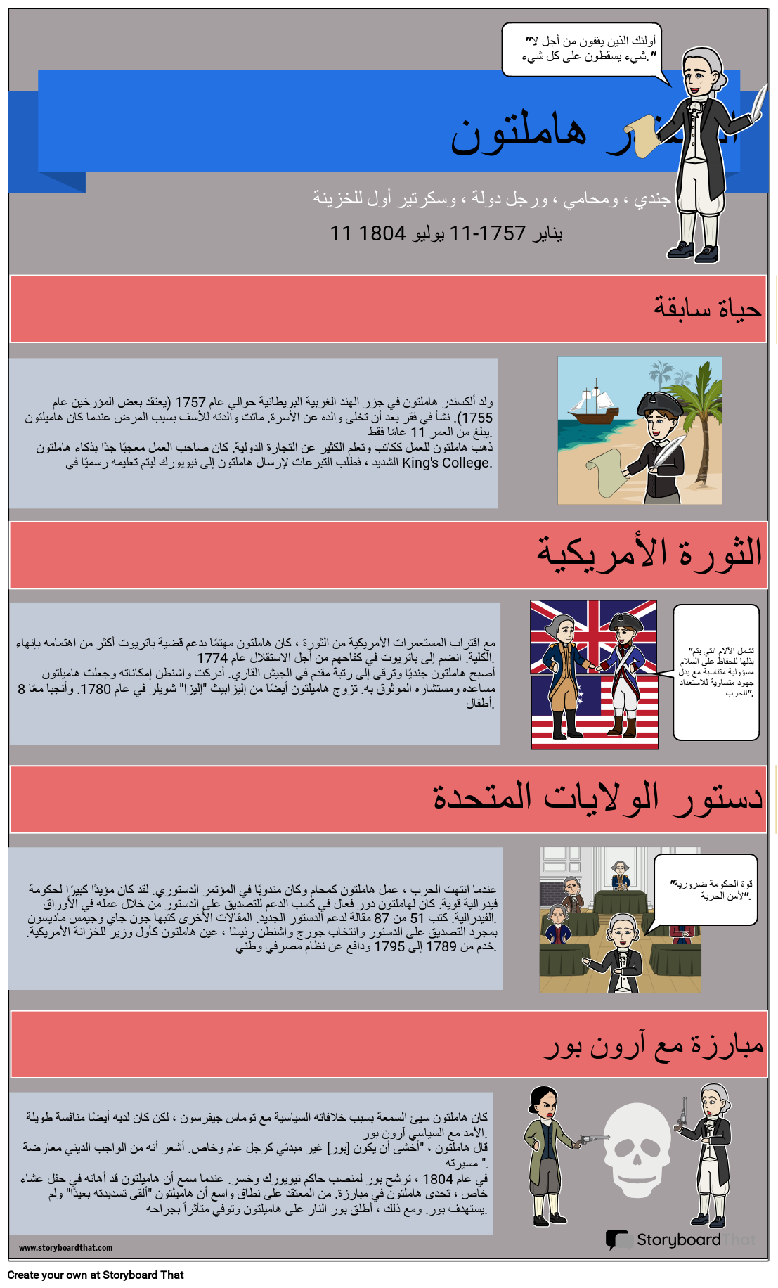 كان هاملتون سيئ السمعة بسبب خلافاته السياسية مع توماس جيفرسون ، لكن كان لديه أيضًا منافسة طويلة الأمد مع السياسي آرون بور. قال هاملتون ، "أخشى أن يكون [بور] غير مبدئي كرجل عام وخاص. أشعر أنه من الواجب الديني معارضة مسيرته ". في عام 1804 ، ترشح بور لمنصب حاكم نيويورك وخسر. عندما سمع أن هاميلتون قد أهانه في حفل عشاء خاص ، تحدى هاملتون في مبارزة. من المعتقد على نطاق واسع أن هاميلتون "ألقى تسديدته بعيدًا" ولم يستهدف بور. ومع ذلك ، أطلق بور النار على هاميلتون وتوفي متأثراً بجراحه.