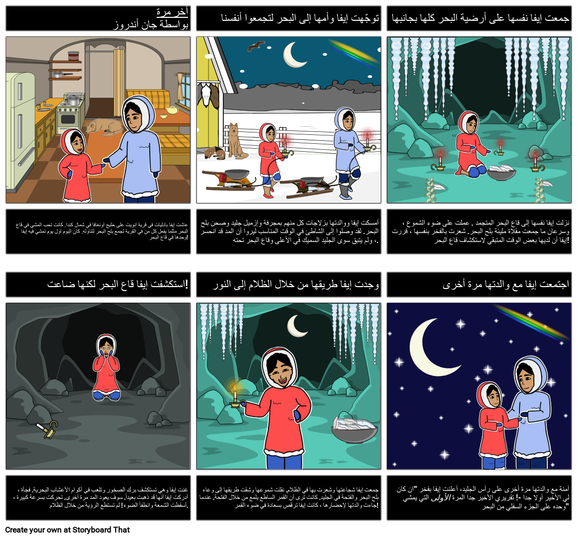 جمعت إيفا شجاعتها وشعرت بها في الظلام. نقلت شموعها وشقت طريقها إلى وعاء بلح البحر والفتحة في الجليد. كانت ترى أن القمر الساطع يلمع من خلال الفتحة. عندما جاءت والدتها لإحضارها ، كانت إيفا ترقص بسعادة في ضوء القمر!