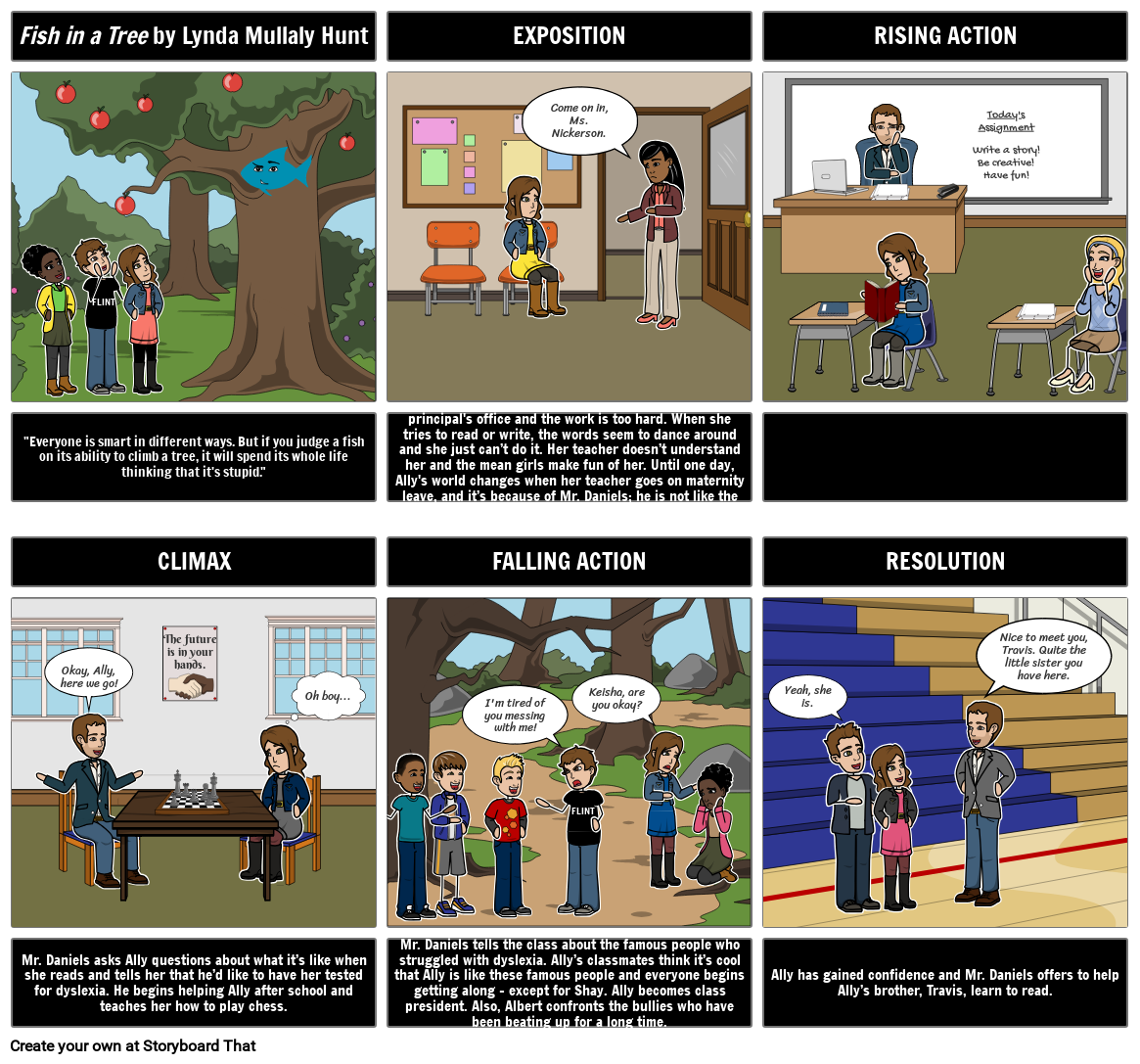 قم بإنشاء ملخص مؤامرة مرئي لـ Fish in a Tree بواسطة Lynda Mullaly Hunt ، مع تسليط الضوء على العرض ، والصراع ، والحركة المتزايدة ، والذروة ، والحركة المتساقطة ، والدقة.