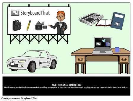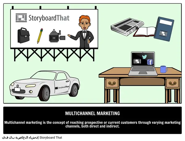 Storyboard That الدليل المصور لشروط العمل - التسويق متعدد القنوات هو مفهوم الوصول إلى العملاء المحتملين أو الحاليين من خلال قنوات التسويق المختلفة ، سواء المباشرة أو غير المباشرة.