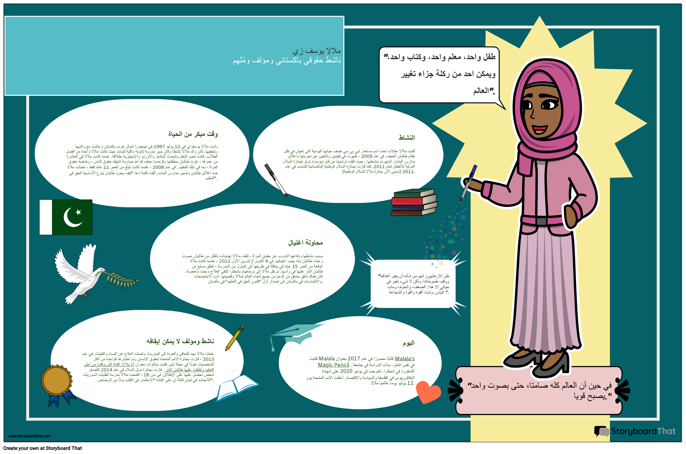 يمكن للطلاب إنشاء ملصق عن السيرة الذاتية لشخصية مهمة في التاريخ الإسلامي ، في الماضي والحاضر. هذا الملصق هو عن Malala!