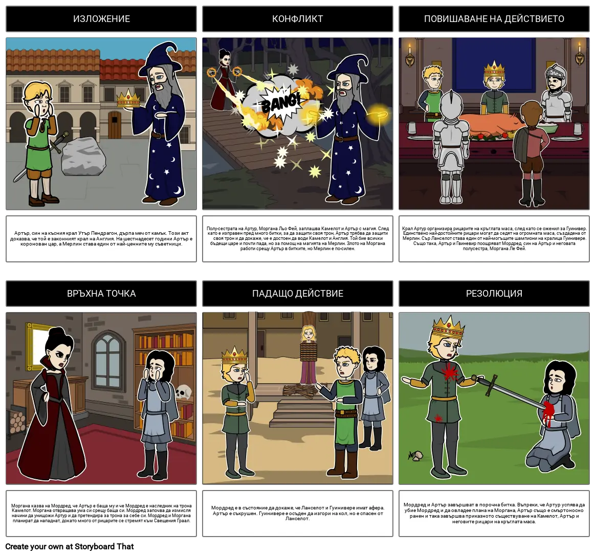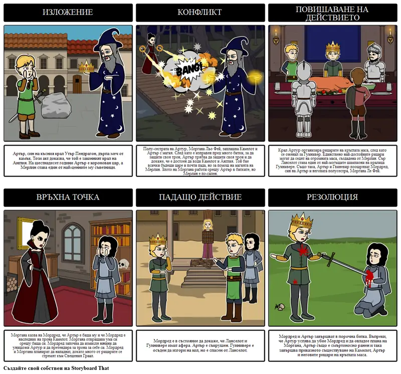 Мордред и Артър завършват в порочна битка. Въпреки, че Артур успява да убие Мордред и да овладее плана на Моргана, Артър също е смъртоносно ранен и така завършва приказното съществуване на Камелот, Артър и неговите рицари на кръглата маса.