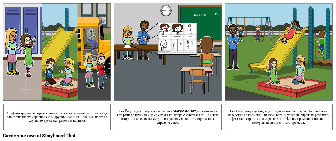 Г-н Йец създава социална история в StoryboardThat да помогне на Стефани да научи как да се справя по-добре с чувствата си. Той чете историята с нея всяка сутрин и практикува нейните стратегии за справяне с нея.