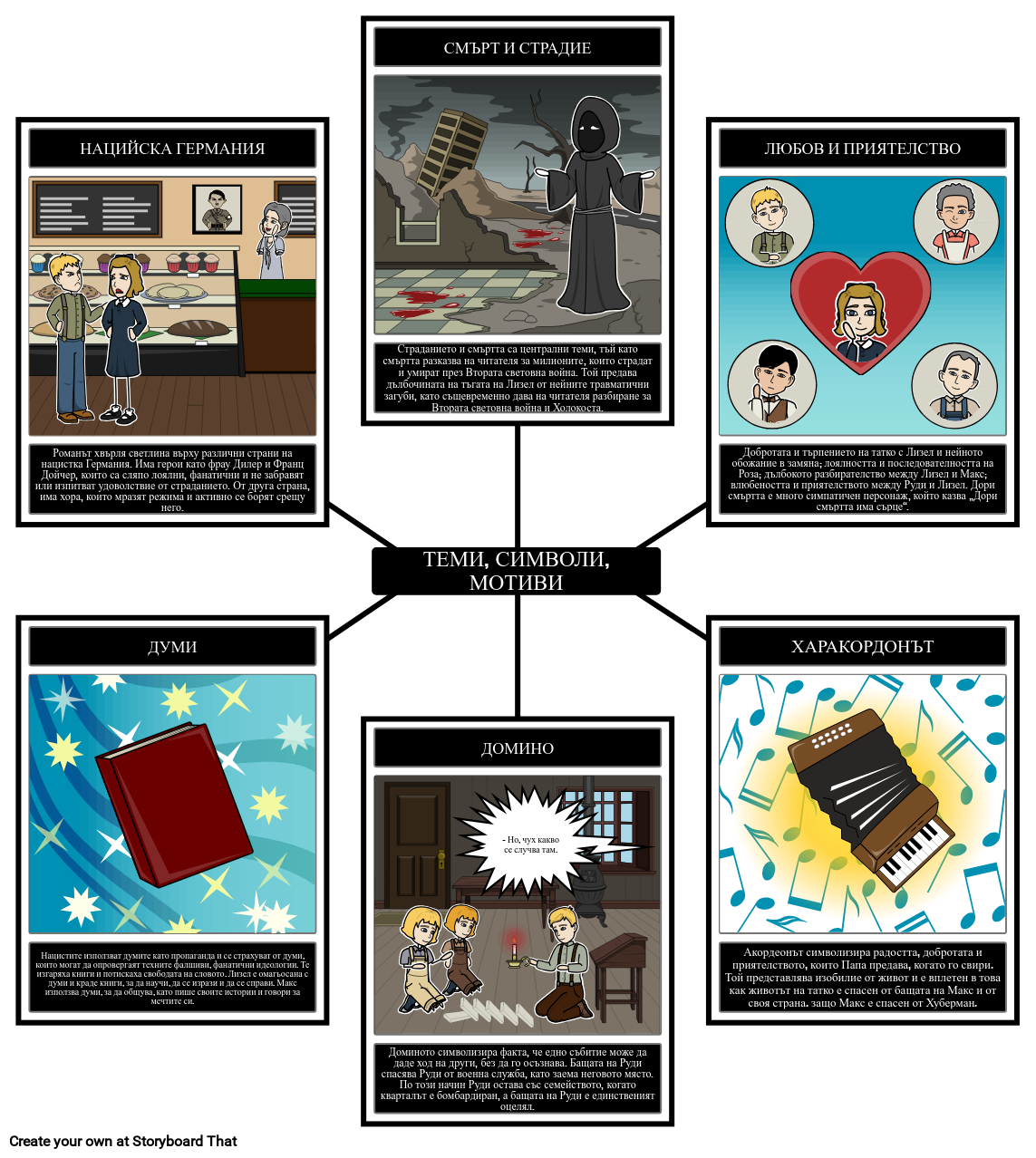 В романа „Крадецът на книги“ има много теми, символи и мотиви. Студентите могат да изследват теми, символи и мотиви в роман, като идентифицират 3-5 и създават карта на паяци от изображения и надписи, изобразяващи примери от текста.