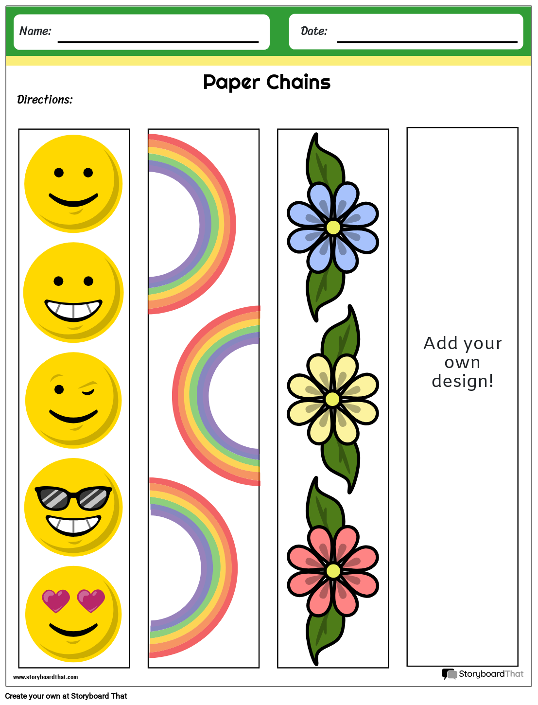 Хартиените вериги са забавен начин да украсите класната стая. Те имат емотикони, дъги и теми с цветя, но учениците и учителите могат да добавят всяко изкуство или дизайн от Създателя, които ги вдъхновяват! Хартиените вериги могат да бъдат отпечатани, изрязани и окачени из класната стая за причудлива украса!
