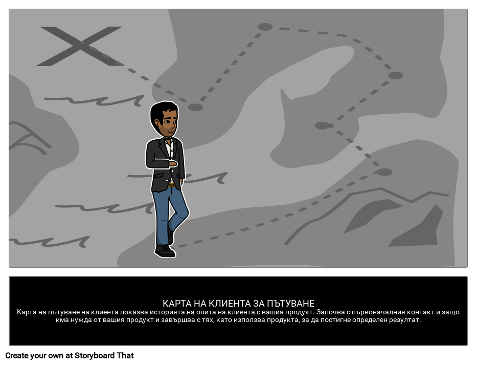 КАРТА НА КЛИЕНТА ЗА ПЪТУВАНЕКарта на пътуване на клиента показва историята на опита на клиента с вашия продукт. Започва с първоначалния контакт и защо има нужда от вашия продукт и завършва с тях, като използва продукта, за да постигне определен резултат.