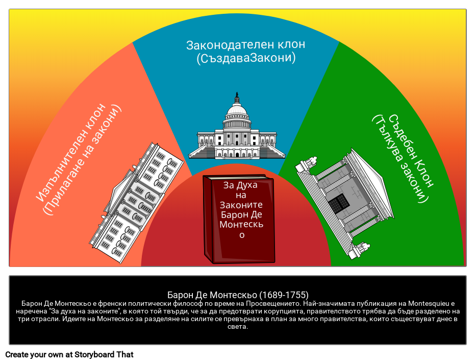 Барон Де Монтескьо (1689-1755) Барон Де Монтескьо е френски политически философ по време на Просвещението. Най-значимата публикация на Montesquieu е наречена "За духа на законите", в която той твърди, че за да предотврати корупцията, правителството трябва да бъде разделено на три отрасли. Идеите на Монтескьо за разделяне на силите се превърнаха в план за много правителства, които съществуват днес в света.
