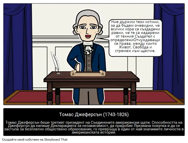 Томас Джеферсън (1743-1826)Томас Джеферсън беше третият президент на Съединените американски щати. Способността на Джеферсън да напише Декларацията за независимост, да придобие Луизиана покупка и да се застъпи за безплатно обществено образование, го превръща в един от най-значимите личности в американската история.