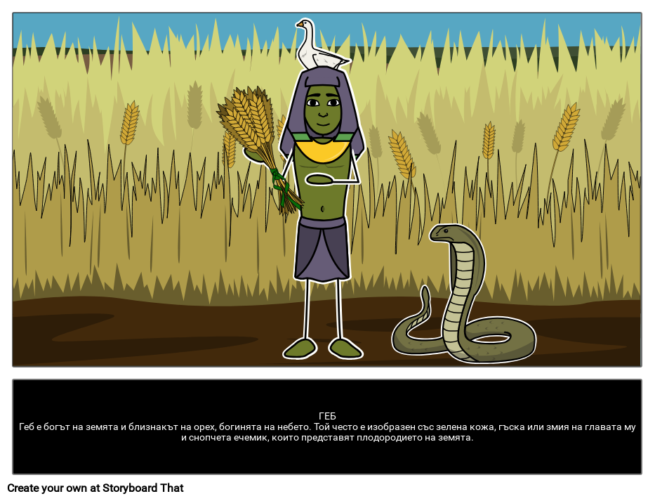 ГЕБГеб е богът на земята и близнакът на орех, богинята на небето. Той често е изобразен със зелена кожа, гъска или змия на главата му и снопчета ечемик, които представят плодородието на земята.