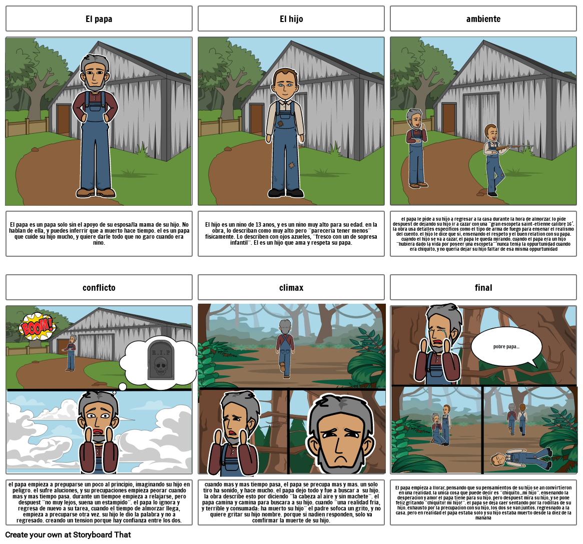 el papa le pide a su hijo a regresar a la casa durante la hora de almorzar. lo pide despuest de dejando su hijo ir a cazar con una ¨gran escopeta saint-etienne calibre 16´. la obra usa detalles especificos como el tipo de arma de fuego para ensenar el realismo del cuento. el hijo le dice que si, ensenando el respeto y el buen relation con su papa. cuando el hijo se va a cazar, el papa le queda mirando. cuando el papa era un hijo ¨hubiera dado la vida por poseer una escopeta¨´nunca tenia la oppurtunidad cuando era chiquito, y no queria dejar su hijo faltar de esa misma oppurtunidad