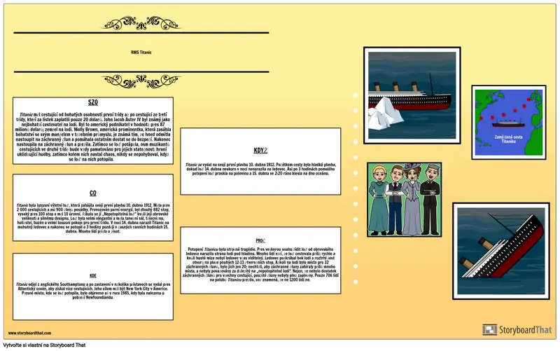 CO Titanic byla luxusní výletní loď, která zahájila svoji první plavbu 10. dubna 1912. Měla přes 2 000 cestujících a asi 900 členů posádky. Provozován parní energií, byl dlouhý 882 stop, vysoký přes 100 stop a měl 10 úrovní. Říkalo se jí „Nepotopitelná loď“ kvůli její obrovské velikosti a silnému designu. Loď byla velmi elegantní a měla taneční sál, tělocvičnu, holičství, bazén a velmi luxusní pokoje pro první třídu. V noci 14. dubna narazil Titanic na mohutný ledovec a nakonec se potopil o 3 hodiny později v časných ranních hodinách 15. dubna. Mnoho lidí přišlo o život.