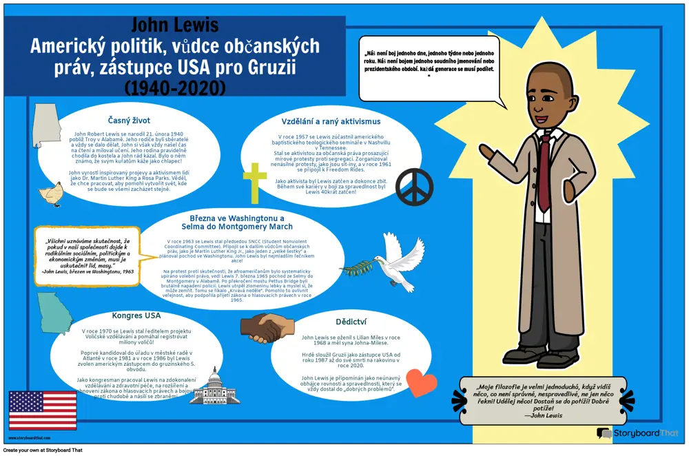 Časný život John Robert Lewis se narodil 21. února 1940 poblíž Troy v Alabamě. Jeho rodiče byli sběratelé a vždy se dalo dělat. John si však vždy našel čas na čtení a miloval učení. Jeho rodina pravidelně chodila do kostela a John rád kázal. Bylo o něm známo, že svým kuřatům káže jako chlapec! John vyrostl inspirovaný projevy a aktivismem lidí jako Dr. Martin Luther King a Rosa Parks. Věděl, že chce pracovat, aby pomohl vytvořit svět, kde se bude se všemi zacházet stejně.