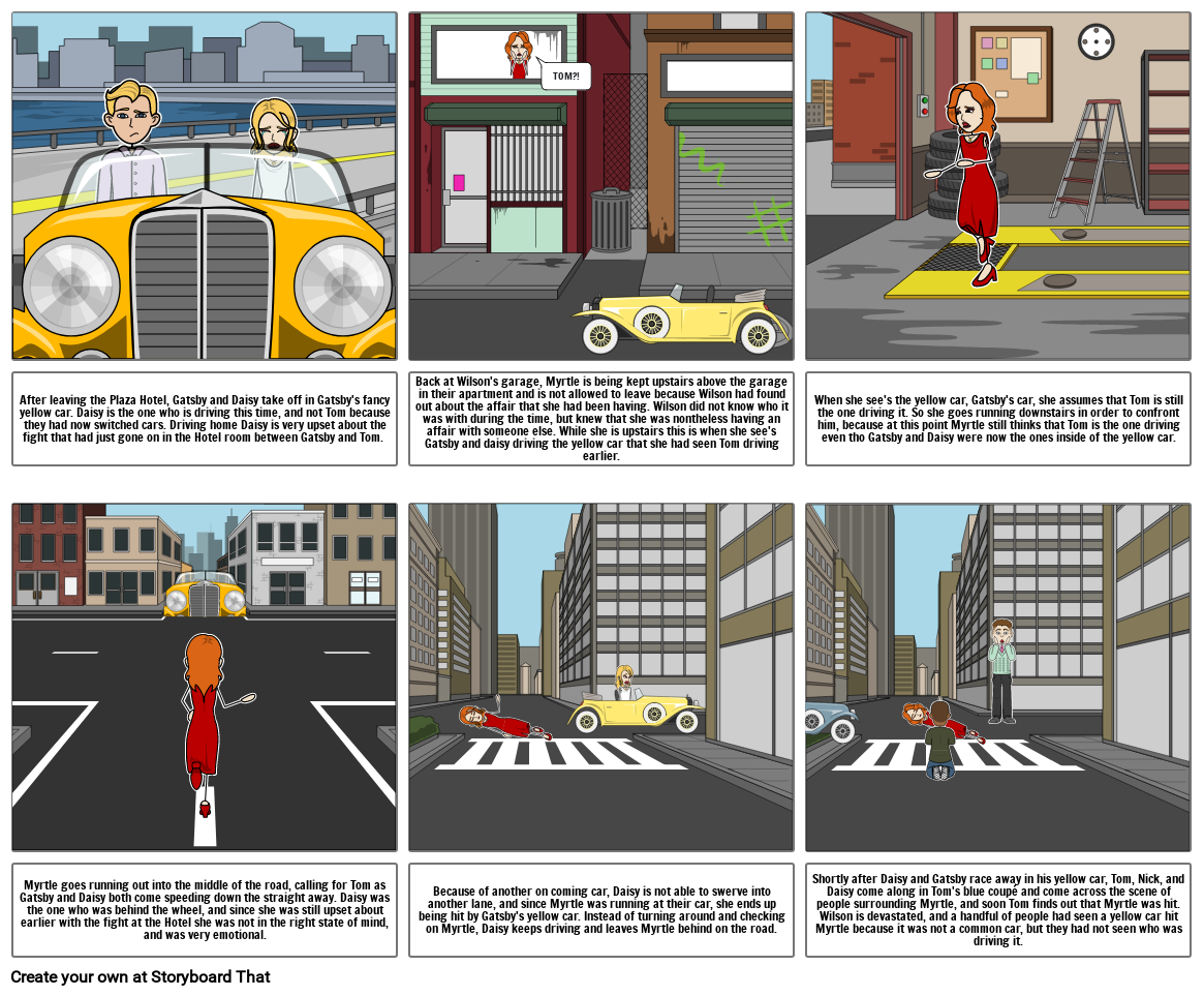 Myrtle goes running out into the middle of the road, calling for Tom as Gatsby and Daisy both come speeding down the straight away. Daisy was the one who was behind the wheel, and since she was still upset about earlier with the fight at the Hotel she was not in the right state of mind, and was very emotional.