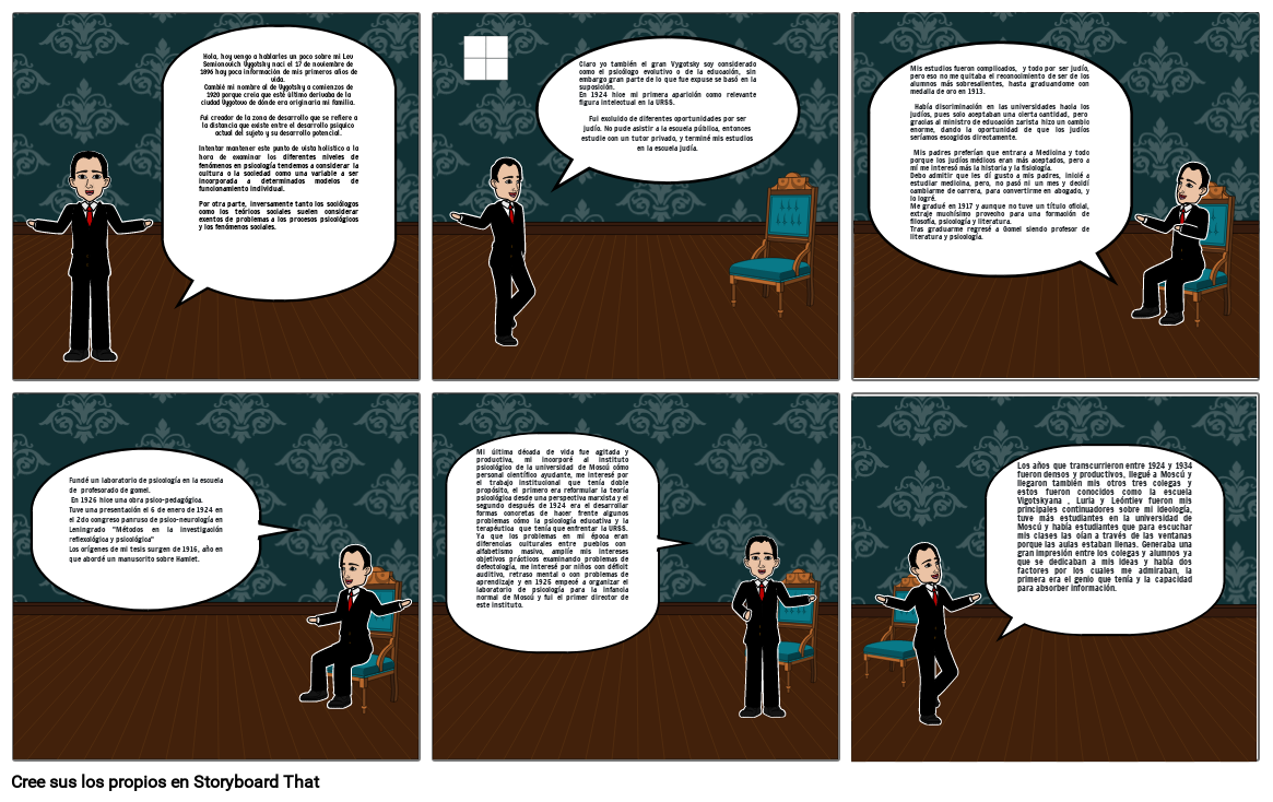 Claro yo también el gran Vygotsky soy considerado como el psicólogo evolutivo o de la educación, sin embargo gran parte de lo que fue expuse se basó en la suposición.En 1924 hice mi primera aparición como relevante figura intelectual en la URSS.Fui excluido de diferentes oportunidades por ser judío. No pude asistir a la escuela pública, entonces estudie con un tutor privado, y terminé mis estudios en la escuela judía.
