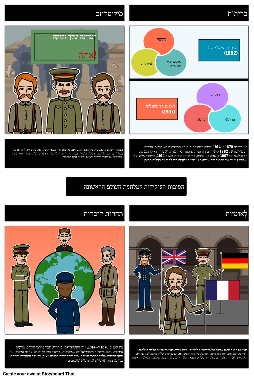 בין השנים 1870 ו -1914 נוצרה רשת בריתות בין המעצמות העולמיות. הברית המשולשת של 1882 קישרה בין גרמניה, אוסטריה-הונגריה ואיטליה ואילו הכניסה המשולשת של 1907 קישרה בין צרפת, בריטניה ורוסיה. בשנת 1914, בריתות אלה יצרו אפקט דומינו של סכסוך שבו מדינות נמשכו למלחמה כדי להגן על בעלות בריתן.