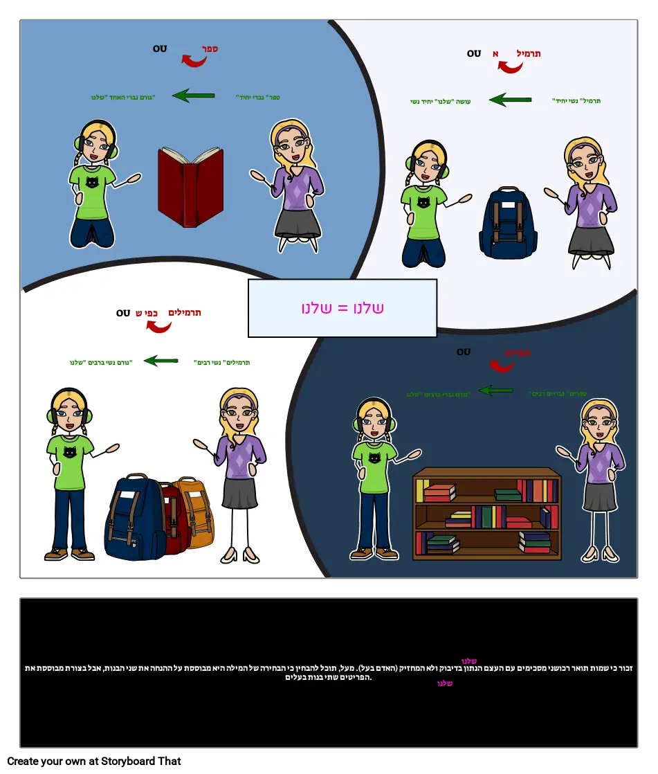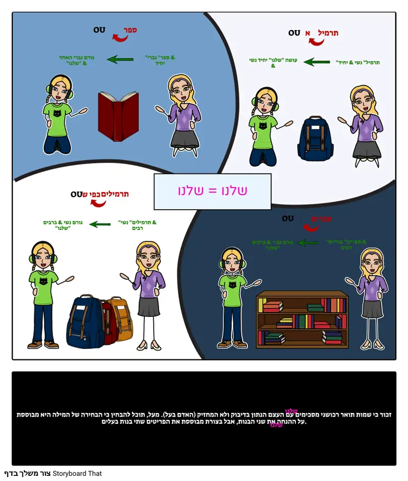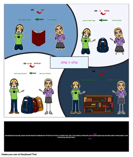 זכור כי שמות תואר רכושני מסכימים עם העצם הנתון בדיבוק ולא המחזיק (האדם בעל). מעל, תוכל להבחין כי הבחירה של המילה היא מבוססת על ההנחה את שני הבנות, אבל בצורת מבוססת את הפריטים שתי בנות בעלים.