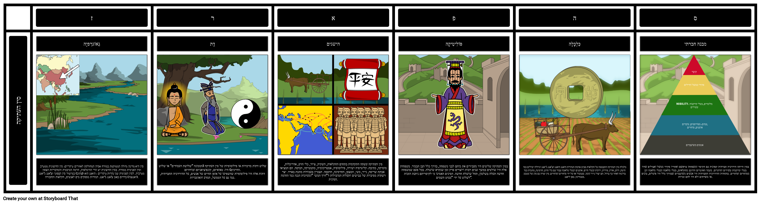 סין העתיקה עשתה התקדמות בתחום החקלאות, השקיה, ציור, כלי חרס, אדריכלות, מוסיקה, כתיבה: קליגרפיה ושירה, פילוסופיה, אסטרונומיה, מתמטיקה, הנדסה. הם המציאו אבקת שריפה, נייר, משי, המצפן, החרסינה, הדפסה. הצטיין בעבודות מתכת בארד. יצר רשתות מסיביות של כבישים ותעלות המובילות ל"דרך המשי "ומערכות הגנה כמו החומה הסינית.